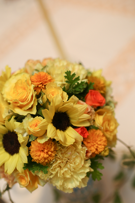 夏らしく”ひまわり”メインの、テーブル装花です♪