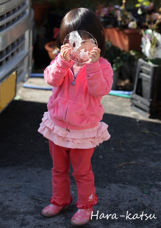 次女が、バケツの中の氷を見つけました(^◇^)