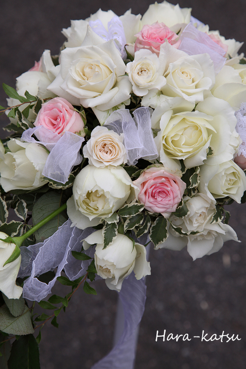 白いバラと淡いピンクのバラのキャスケードブーケです。