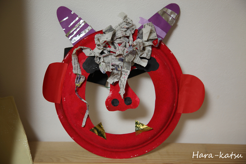 写真は長女が幼稚園で作った”赤オニさんのお面”です!