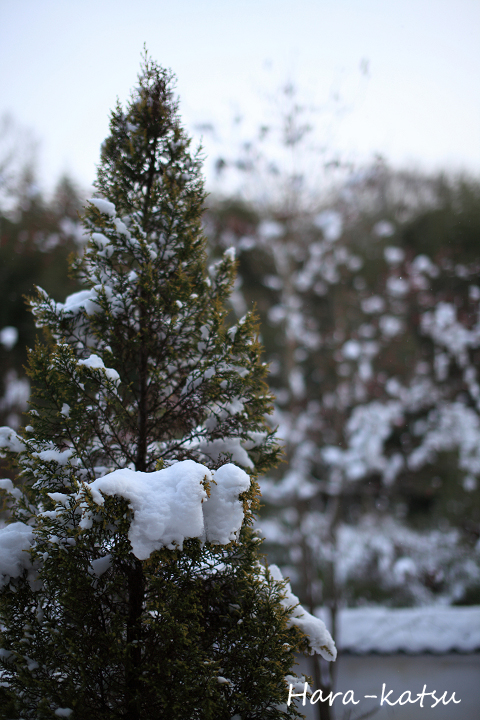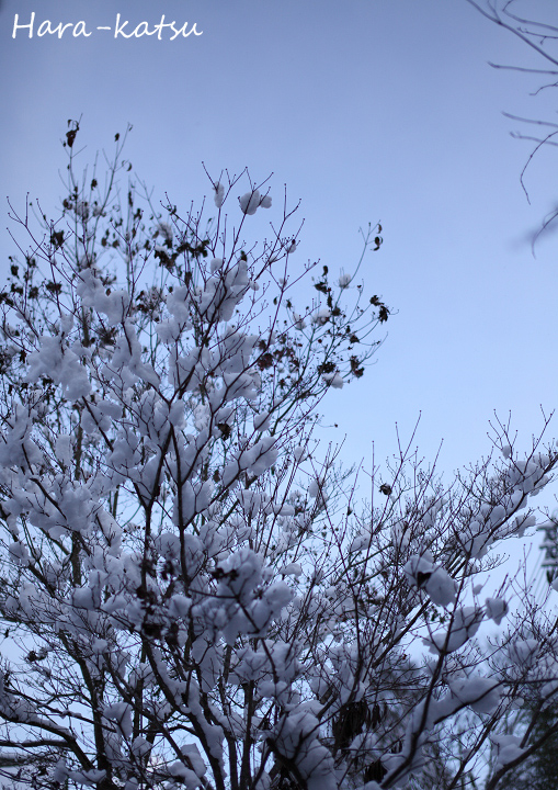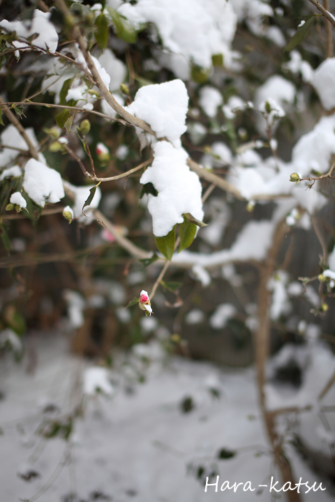 雪降る庭に見つけた、”ツバキ”のつぼみです。