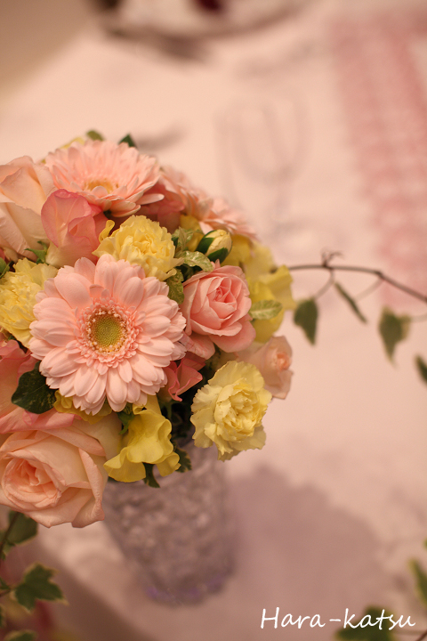 薄めのピンク色とイエローを使用した、ラウンドアレンジメントです。