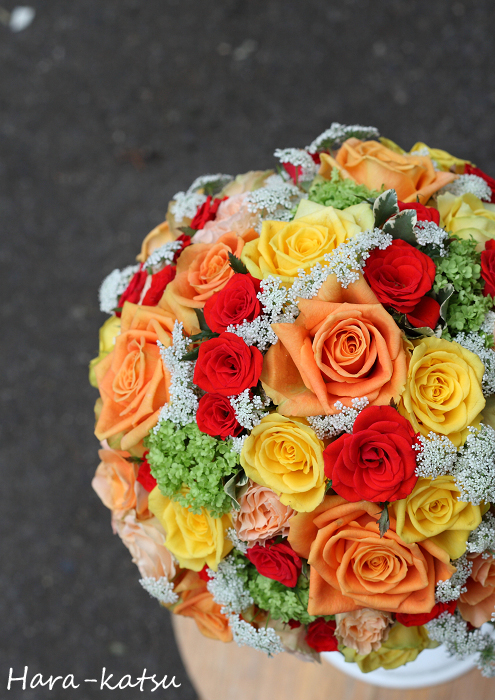 オレンジのバラ”オレンジデュカット”をメインに使用したラウンドブーケです。